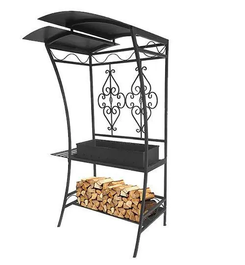 Стационарный мангал для приготовления пищи на открытом огне изготовлен из стали. В конструкции предусмотрена крыша, размещённая над коробкой мангала. Крыша выносная, она защищает работающего у мангала человека от атмосферных осадков. Для удобства использования, в нижней части мангала имеется полка для хранения дров и аксессуаров по уходу за мангалом. В нижней части мангала имеется полка для хранения дров и аксессуаров по уходу за мангалом. Кованые элементы делают дизайн стационарного мангала интересным, а конструкцию более прочной. По краю коробки мангала приварен кованый пруток, предотвращающий деформацию стенок мангала при нагреве металла. Боковая полка мангала Викинг в виде решётки.
