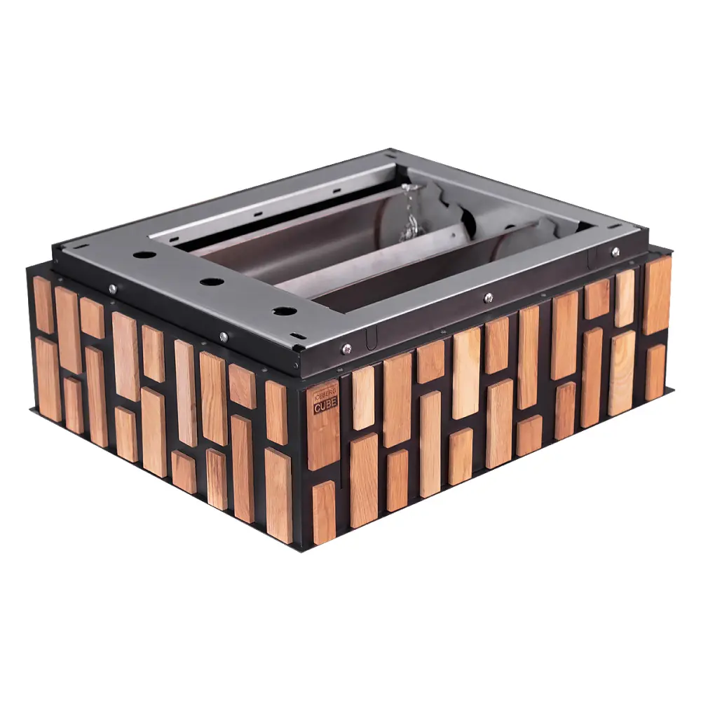 Брутальные обливные устройства в облицовке из натурального дуба для Вашей бани «Iceberg CUBE W». Резервуар устройств выполнен из нержавеющей стали AISI 304, корпус покрашен чёрной матовой порошковой эмалью и инкрустирован вставками из натурального дуба от компании «Woodson».