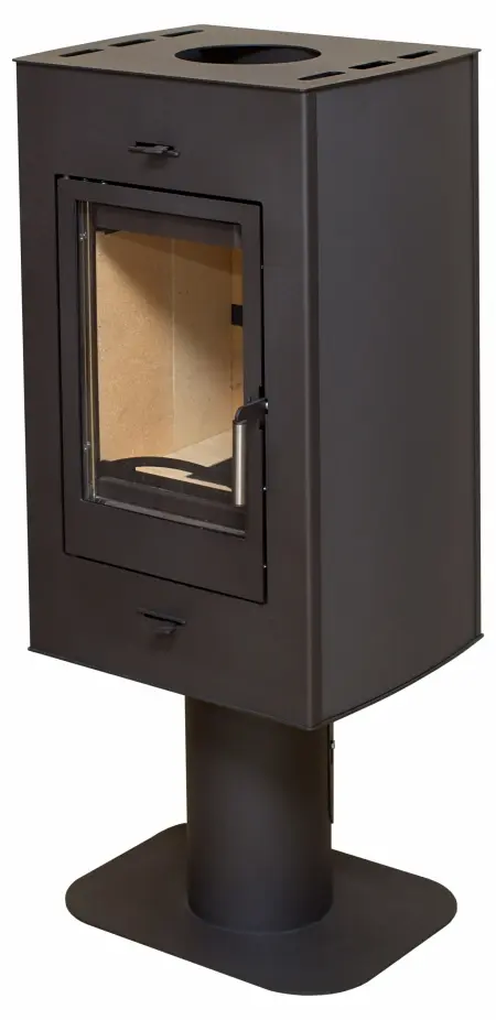 “Рона” - это компактная и аккуратная печь-камин, изящное и стильное решение для обогрева дачного домика или небольшого коттеджа. Горизонтальный прямоугольный корпус, установленный на круглой ножке с устойчивым широким основанием, не занимает в помещении много места - печка подойдет как для пристенной, так и для угловой установки. Дымоход выводится сверху, дополнительный фундамент не требуется. Глубина корпуса небольшая, однако топка спокойно вмещает поленья длиной до 32 см, если установить их вертикально.