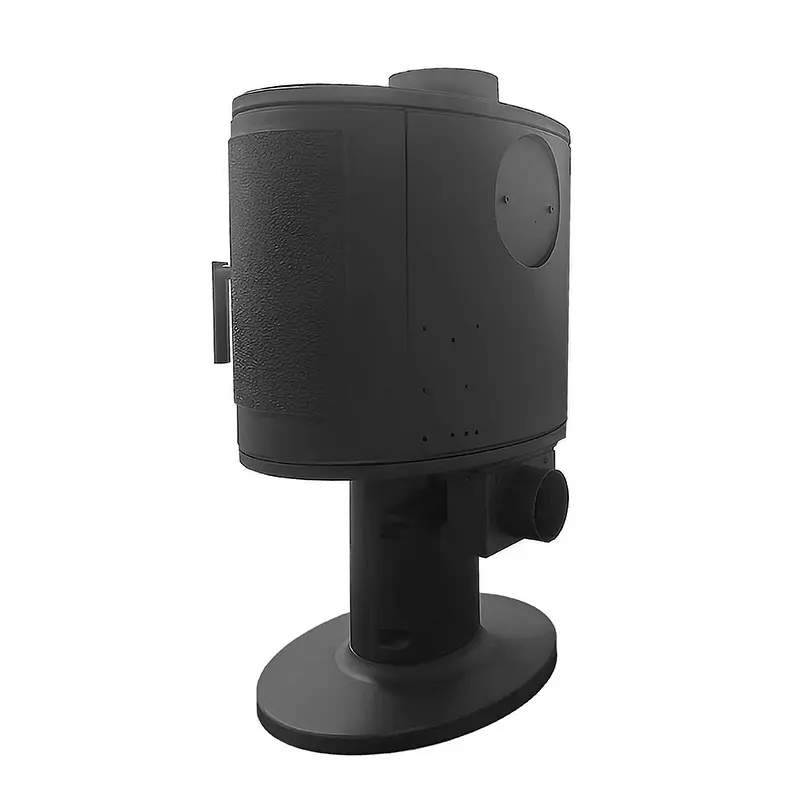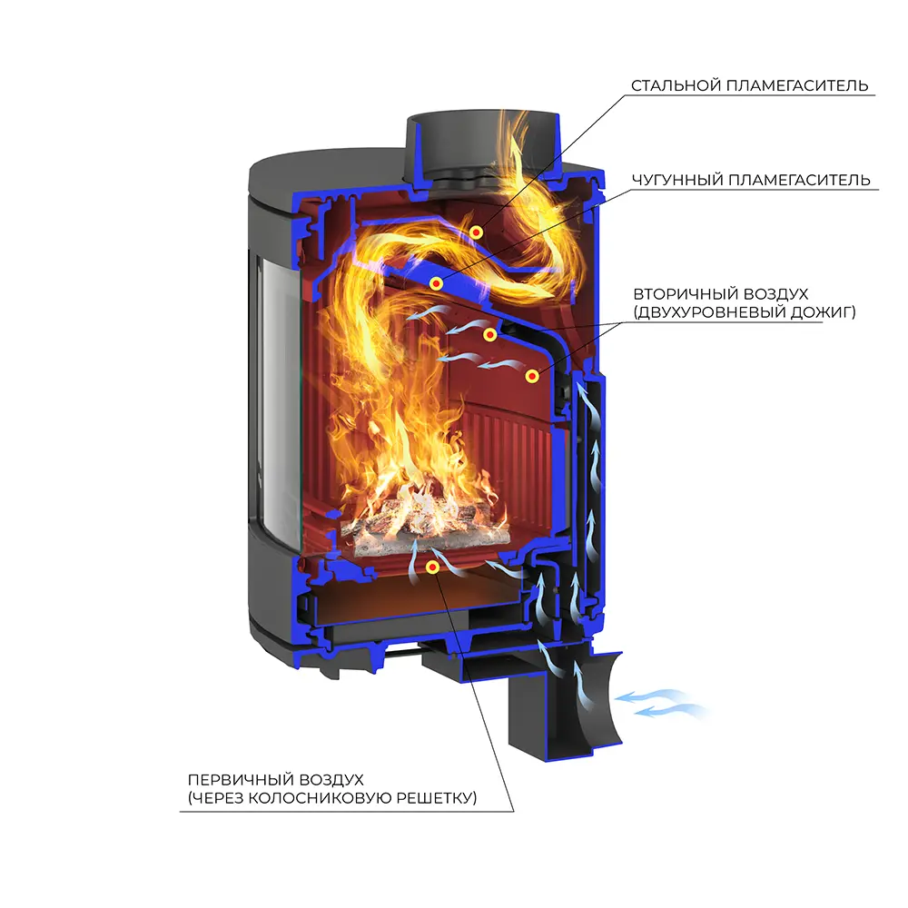 Печь-камин изготовлена из качественного жаростойкого чугуна с толщиной стенок 6-8 мм. Модель рассчитана на обогрев помещений объёмом до 180м³. Печь-камин имеет два пламегасителя: самый нагруженный пламегаситель изготовлен из жаростойкого чугуна, второй из особо прочной котловой стали 09Г2С. Топка печи-камина усилена чугунными вставками с системой двухуровневого вторичного дожига. Регулировка этой системы, как и подача воздуха в колосниковую зону, осуществляется рычагом, расположенным слева в нижней части печи-камина. В правой нижней части расположена ручка регулировки системы чистое стекло, которая помогает оставаться стеклу чистым. Патрубок дымохода Ø 150мм – универсальный, со сменным положением. Он может быть установлен сверху или сзади.